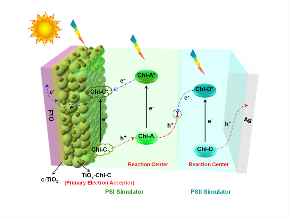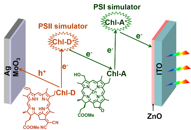 王晓峰教授课题组以叶绿素衍生物作为主要光敏半导体材料,将其应用于染料敏化太阳能电池、有机太阳能电池、钙钛矿太阳能电池等薄膜太阳能电池器件。在此基础上,受自然界中光合作用的启发,课题组模拟自然界Z型光合作用的电子传递方式,设计出两种仅由叶绿素衍生物为光敏材料构成的双层和三层全叶绿素生物仿生太阳能电池,为薄膜太阳能电池的进一步发展带来了全新的研究视角。