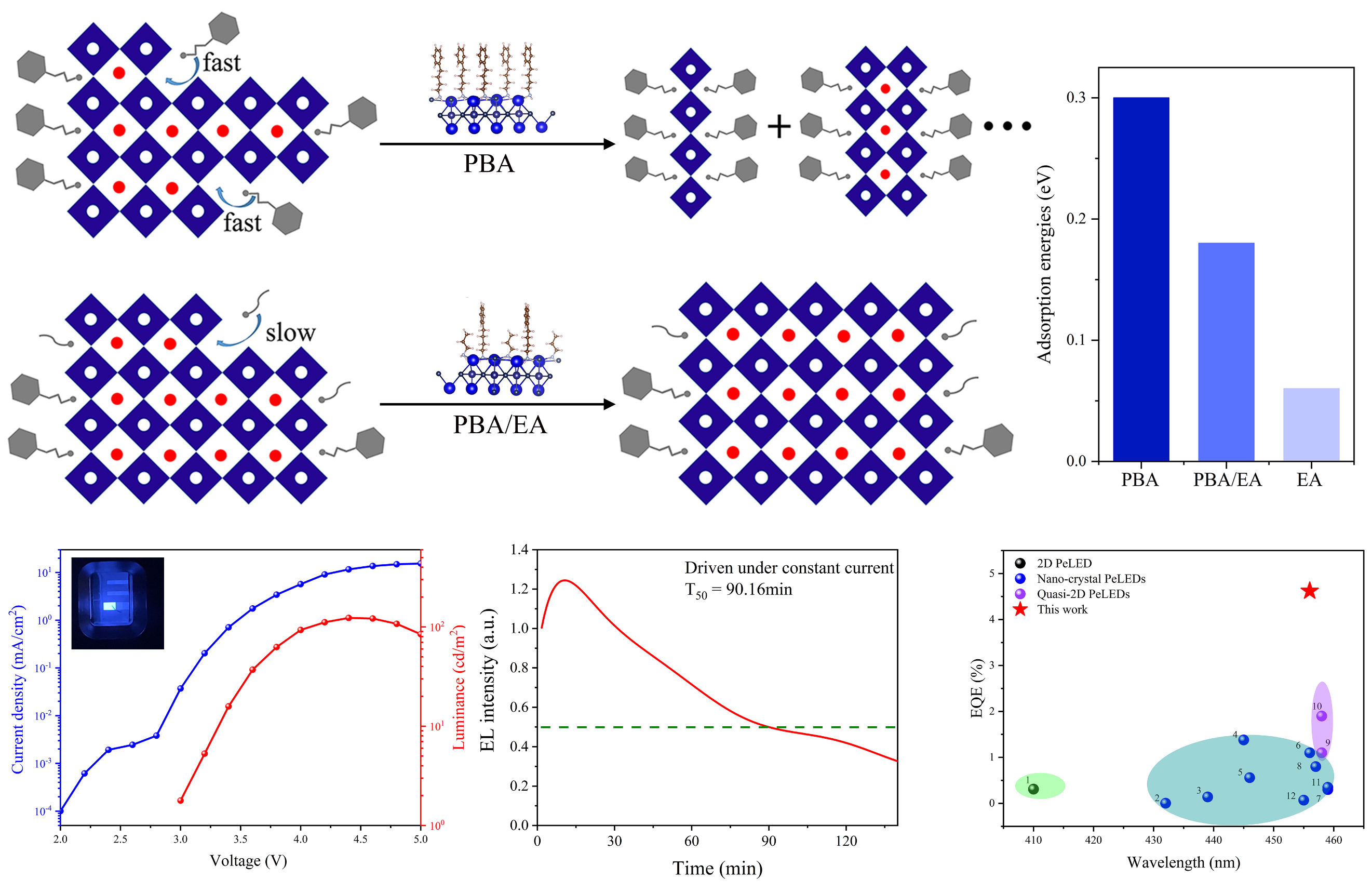 基于此,王宁教授研究团队提出并实现了一种新的策略:通过利用不同配体与卤化物钙钛矿表面的吸附能差异(Adsorption-Energy Difference)来有效控制配体与发光材料之间的作用速率,进而达到精确控制低维钙钛矿n值分布的目的,并实现高效深蓝光电致发光器件。通过DFT理论计算,作者选择了具有高低吸附能特性的配体作为研究对象,首次成功揭示了吸附能差异对降低维度的钙钛矿薄膜维度再分布的作用与机制。通过减缓具有更小吸附能的配体与钙钛矿之间的作用速率来抑制低维钙钛矿相值n,达到促进不同维度之间的能量传递的作用。这种新的维度调节机制提供了更加直观的结构分布机理,将对低维度钙钛矿的光电器件发展提供一条切实可行的技术路线与理论基础。最终,作者成功制备了发光中心波长为457 nm的高效(EQE = 4.62%)稳定(T50 = 90.16 min)深蓝光PeLEDs,该结果为目前铅基深蓝光PeLEDs领域的最高效率。此外,为证明该方法的普适性,作者采用该策略制备了青色,天蓝色,纯蓝色的PeLEDs,上述器件均证明了该方法的有效性。