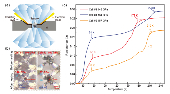新型高温超导相一直是超导研究领域的焦点和目标。目前实验上已经获得了几种具有高温超导性的氢化物,但是实验制备Tc>200 K的高温超导材料仍然极具挑战性。亚稳相通常具有优越的性质,新型亚稳相的发现是物理和材料科学领域获得创新性成果的重要途径。在超导研究领域中,亚稳相是提高Tc或降低稳定压力的重要候选体系。以高压原位实验技术为核心,截获超导性质优异的亚稳富氢化合物是目前存在的关键科学问题。课题组通过引入适当含量的Al原子,成功将理论预测在420 GPa以上才能稳定的P63/mmc-LaH10稳定至146 GPa,其超导转变温度最高可达223 K。此项工作对三元及多元超导富氢化合物的研究有着重要的参考意义,同时为获得具有优异超导性质的亚稳态高温超导富氢化合物提供了一种新策略。