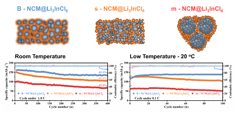 研究人员采用机械工程的方法合成了复合电极,在复合电极中商用三元正极材料(NCM)和卤化物固态电解质(Li3InCl6)之间形成均匀且超共形的互穿网络,实现了离子、电子的快速传输。且复合电极表现出优异的机械性能,具有高杨氏模量和维氏硬度,可承受全固态电池电极在充放电过程中发生的化学-机械变形,从而保证复合电极结构的完整性与稳定性。这种方法显著提高了全固态电池的能量密度与循环寿命,0.1C电流密度下,比容量达到 216.4 mAhg-1,首次库仑效率高达91.6%,可与NCM在有机液态电池中的性能相媲美。此外,所提出的全固态电池还具有理想的低温性能,在0℃和-20℃时的容量分别为172.5 mAhg-1和118.4 mAhg-1,是目前全固态电池在低温领域报道中的最高值。这项研究为全固态电池的电极设计,以及在宽温度范围内应用并实现优异性能提供了一种前景广阔的策略。