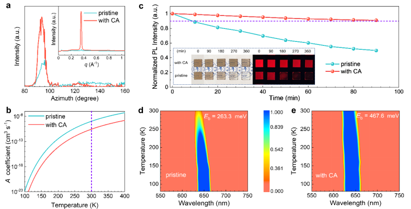 2)CA的独特功能性。与传统的单一官能团试剂不同,CA除了具有抗氧化作用之外,还具有其它诸多效力。首先,CA互变异构混合物形成的二聚体和三聚体超结构可以钝化薄膜表面缺陷;其次,CA的多官能团特性使得其在形成二聚体/三聚体之后,仍然有多余的官能团可以与钙钛矿配位,起到稳定晶界的作用,从而显著提高Sn基钙钛矿的晶体稳定性;最后,CA互变异构混合物配位能诱导Sn周围电子局域,这有助于获得更稳定、有序地钙钛矿晶格,从而弱化安德森局域化的不利影响,使得优化后的TEA2SnI4薄膜的非辐射复合系数降低两个数量级,激子束缚能提高两倍。
