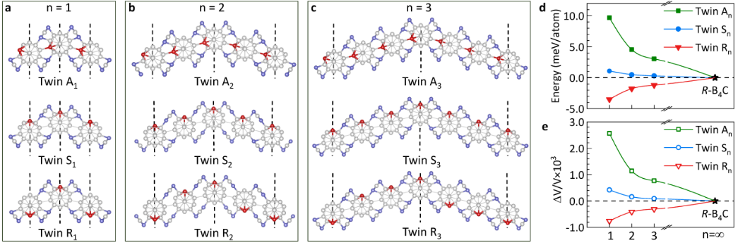 本工作选取一类重要的候选超硬材料“二十面体笼型硼化合物”为研究对象,发展出适用包含复杂结构单元的孪晶结构设计方法(图1),编写了自主知识产权软件,提出了一种孪晶化诱导结构稳定的有趣机制,设计出多组以致密孪晶为特征的稳定晶体结构。与原始晶体相比,这些孪晶相不仅具有更低的能量,还显示出更优越的力学性能。例如,菱方相碳化硼(R-B4C)长期被认为是B4C的最稳定单晶结构。基于自主发展的孪晶结构设计方法,采用“释放晶体复杂成键网络中的原生应变”策略,本研究设计出了一系列能量低于R-B4C的孪晶相B4C结构(图2)。随着缺陷(孪晶)密度的增加,孪晶相的能量逐渐降低。结果显示,具有最致密周期性的孪晶相Twin R1结构是B4C的最稳定晶体结构,其理想剪切强度到达50 GPa,比R-B4C提升约25%。该现象还在二十面体笼型硼化合物B6O、B6N和B13CN中出现。当前研究展示了在此类复杂共价键晶体中孪晶诱导的晶体稳定机制,丰富了含缺陷晶体的构效关系,为高性能超硬材料的结构设计和制备提供了新思路。
