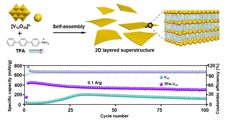 基于此,该论文构建了一种多钒氧簇基疏水性二维层状超结构。这种超结构(TPA-V10)是通过具有疏水三联苯基团的有机阳离子(TPA)和无机簇V10O286-(V10)在水溶液中自组装而成。TPA-V10的疏水性显著减轻了V10在水系电解液中的溶解,改善了TPA-V10电极在循环过程中的结构稳定性,抑制了相变和副产物的积累。相比于V10簇,二维层状超结构提供了更大的表面积,改善了电子导电性,并促进了V10簇在层间的无定形排列,从而加速了活化过程,提高了比容量并加快了反应动力学。此外,TPA-V10展示了显著的循环稳定性和长的使用寿命(在10 A g–1下10,000次循环),同时提高了工作电压(0.94 V对比0.81 V)。本研究为多钒氧簇基正极材料的开发提供了新的思路。