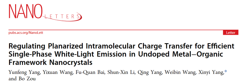 超硬材料国家重点实验室杨新一课题组利用压强处理工程调控非掺杂[Zn(Tdc)(py)]n MOFs纳米晶的双荧光态,在环境条件下实现了材料高效白光发射。相关研究成果以“Regulating Planarized Intramolecular Charge Transfer for Efficient Single-Phase White-Light Emission in Undoped Metal–Organic Framework Nanocrystals”为题发表在《Nano Letters》上。