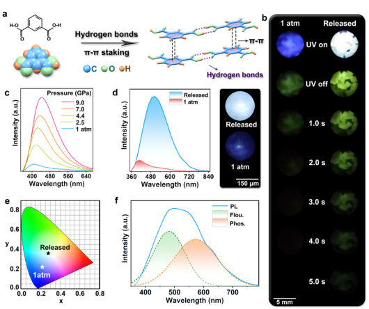 近日,成人网站 超硬材料国家重点实验室邹勃团队杨新一课题组与北京高压科学中心郑海燕研究员和李阔研究员、国家脉冲强磁场科学中心韩一波教授、日本大强度质子加速器设施—“J-PARC”Takanori Hattori研究员、成人网站 朱品文教授、刘兆东教授和杨兵教授、中国工程物理研究院房雷鸣研究员等人合作,利用压强处理工程和氢键协同效应,在不含重原子的有机小分子间苯二甲酸(IPA)材料中点亮三重态激子,提高磷光效率和寿命,实现高效荧光/磷光混合型白光发射。相关成果以“Brightening triplet excitons enable high-performance white-light emission in organic small molecules via integrating n-π*/π-π* transitions”为题发表在《Nature Communications》(Nat. Commun. 2024, 15, 7778)上。