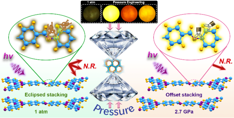 基于可设计的拓扑结构,COFs材料能够将不同荧光单元直接组合到框架中,在开发高效发光材料方面具有独特的优势。然而,由于分子内旋转,振动和强π−π相互作用,导致大多数二维COFs材料表现出较弱的发光特性。压强作为独立于温度和化学组分的基本热力学参量,可以有效调控物质的晶体结构和电子结构,赋予材料优异的光学性能。基于此,杨新一课题组提出利用压强调控分子间相互作用和分子堆叠构型,实现初始弱荧光二维COFs材料的高效黄光发射和显著变色行为。