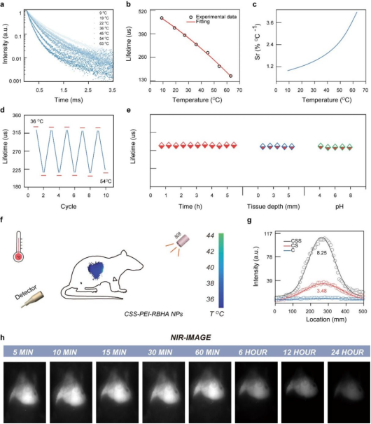 图5. (a) 温度依赖的荧光寿命;(b) 寿命与温度的校准曲线;(c) 相对灵敏度;(d)加热-冷却循环中的寿命;(e)连续激光照射、不同pH和组织穿透深度下的寿命;(f) 注射CSS-PEI-RBHA NPs后活体小鼠肝脏的温度成像;(g) NIR成像信噪比;(h) 使用CSS-PEI-RBHA NPs的活体实时NIR成像。