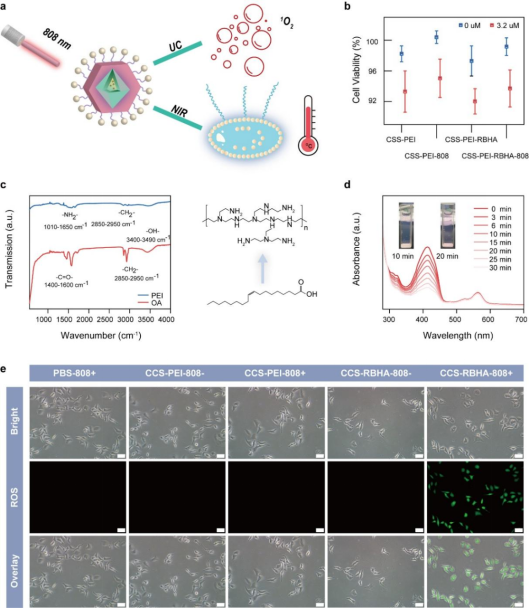 图4.(a) ROS生成过程中温度监测示意图;(b) 细胞活性;(c) OA修饰和PEI修饰CSS NPs的FT-IR光谱;(d) 808 nm照射不同时间的吸收光谱;(e) 不同条件下ROS的生成检测。