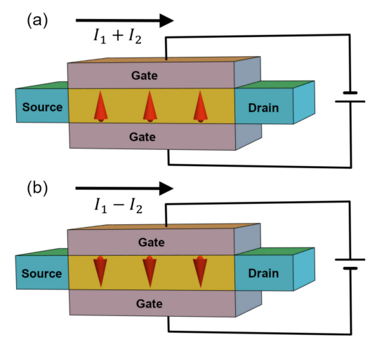 电场可切换的纵向非线性电导的检测。其中,上极化状态(a)和下极化状态(b)分别呈现I1+I2和I1-I2的二阶非线性电流。具有电场可切换非线性电导特性的材料以黄色标示,红色箭头标记其极化方向,黑色箭头表示载流子从源极流向漏极的路径。