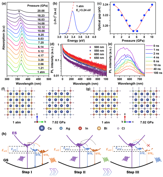 此外,如果Cs2AgIn0.9Bi0.1Cl6纳米晶的吸收峰起源于Bi 6s-6p跃迁,则由于上述所述的晶体场强的持续增强,Cs2AgIn0.9Bi0.1Cl6纳米晶的吸收峰亦同样应该表现出连续的红移。而高压原位吸收光谱表明,随着压力的增加,高压下Cs2AgIn0.9Bi0.1Cl6纳米晶的吸收峰先红移再蓝移。吸收峰随压力的异常蓝移进一步排除了与Bi3+吸收相关的认知,主要由于高压下BiCl6的倾斜和扭曲使得Bi 6s、Ag 5d和Cl 3p轨道之间的耦合减弱,价带顶下移导致带隙减小,吸收蓝移。