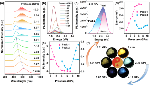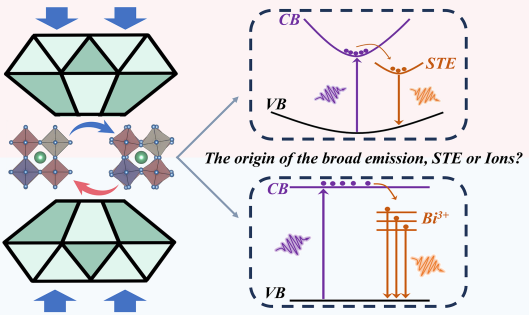高压与超硬材料全国重点实验室邹勃教授团队肖冠军教授等人,通过引入高压维度,探索合金双钙钛矿Cs2AgIn0.9Bi0.1Cl6纳米晶宽辐射发光的压力响应,成功揭示了高亮度宽辐射发光主要源于自陷态激子发光,而非ns2电子组态的金属Bi3+离子发光,解决了长期以来关于Cs2AgIn0.9Bi0.1Cl6纳米晶宽辐射发光起源的争议。研究表明,宽辐射发光包含了两种自陷态,分别与BiCl6-AgCl6和InCl6-AgCl6两种八面体结构有关。高压下晶体场强度和宽发射波长之间的负相关性,排除了宽发射源于Bi3+从3Pn(n=0,1,2)到1S0跃迁,从而为其宽发射源于自陷态激子辐射复合提供有力的压力依据,进一步加深了对铟基双钙钛矿光物理机制的理解,促进高压为常压科学服务。相关工作以“Self-Trapped Excitons or Bi3+ Ions for Broad Emission in a Lead-Free Double Perovskite? Hearing What Pressure Says”为题,发表在《Nano Letters》上。