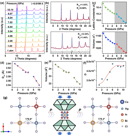具有ns2电子组态的Bi3+金属离子掺杂,打破了Cs2AgInCl6晶格的反演对称性,导致从宇称禁戒跃迁到光学允许的带边跃迁转变。由于双钙钛矿低电子维度的固有性质,使得吸收谱呈现类分子结构的尖锐吸收峰。Rietveld结构精修和密度泛函理论计算表明,随着压力的增加,AgCl6、InCl6和BiCl6八面体表现出持续的收缩。然而,当施加的压力超过6.04 GPa时,顶角相连的BiCl6八面体呈现垂直于[010]方向的轻微旋转,导致相邻AgCl6八面体的相反方向上的倾斜。而高压下Cs2AgIn0.9Bi0.1Cl6纳米晶内卤化物八面体的局域畸变对于发射峰的劈裂具有主要贡献和作用。