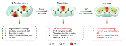 新型电池物理与技术教育部重点实验室杜菲教授、姜珩教授、魏芷宣教授、浙江大学陆俊教授合作在锂金属电池研究方面取得重要进展,通过“邻近基团参与效应”(Neighboring Group Participation, NGP),成功实现了锂金属电池在-40℃至60℃宽温度范围内的稳定循环。相关成果以“Neighboring alkenyl group participated ether-based electrolyte for wide-temperature lithium metal batteries”为题,于2025年8月在线发表在《自然通讯》(Nature Communications)上。