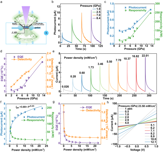 在本研究中,李顺心课题组提出了一种基于二维层状钙钛矿(API)PbBr4的高压稳健型光电探测器,研究了(API)PbBr413.5 GPa压力下的结构演化和光电性能调控。结果表明,该材料表现出压力驱动的光电探测器性能增强,包括于13.5 GPa压力下高达248.0 A W⁻¹的响应度,比探测率超过2.2 × 10¹² Jones,以及高达8.4 × 10⁴%的外量子效率。与其在1.9 GPa初始压力下的性能相比,光电流、响应度和外量子效率均增加了2.5倍以上,比探测率提高了5倍以上。这些发现不仅揭示了二维层状钙钛矿在高压条件下的结构-性能耦合机理,而且为设计能够在极端环境下工作的高性能紫外光电探测器提供了理论基础和实用策略。