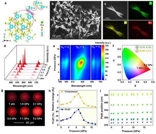 铕基金属有机框架材料由于其配体结构的可调性和镧系元素的固有性质,为光致发光材料的发展提供了一个独特的平台。然而,由于从有机配体到金属中心的能量转移(LMET)效率较低,限制了它们的发光效率,阻碍了其进一步的实际应用。高压技术作为一种高效且清洁的手段,可以在不改变材料化学成分的情况下,有效调控材料的晶体结构和电子结构。同时,压强还具有通过有效调节分子间的非键相互作用来抑制分子内运动的潜在优势。基于此,杨新一课题组引入压强调控LMET过程,实现初始弱荧光Eu-MOFs材料的高效红光发射行为。