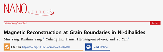 闫羽教授与西班牙CIC nanoGUNE BRTA 杨百顺博士合作,在二维范德华阻挫磁体晶界磁性重构与拓扑自旋织构调控方面取得研究进展。研究团队通过第一性原理计算结合原子尺度自旋模拟,成功实现了对Ni-dihalides晶界磁结构的系统分析,揭示了晶界可稳定超小尺寸斯格明子/反斯格明子及其定向输运机制。相关研究成果以 “Magnetic Reconstruction at Grain Boundaries in Ni-dihalides”为题发表在《Nano Letters》杂志上。