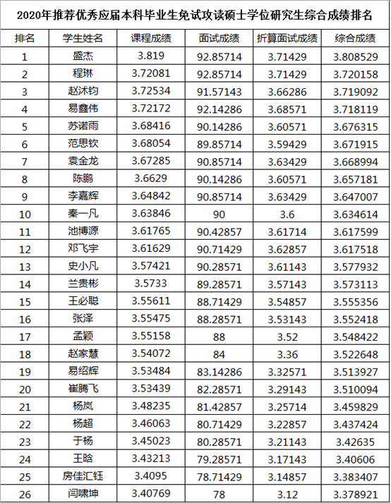 根据《成人网站 推荐优秀应届本科毕业生免试攻读硕士学位研究生工作管理办法》(校发[2019]48号)、《成人网站 2020年推荐优秀应届本科毕业生免试攻读硕士学位研究生工作细则》文件规定,现将成人网站 2020年推荐优秀应届本科毕业生免试攻读硕士学位研究生面试成绩和综合成绩排名予以公示。