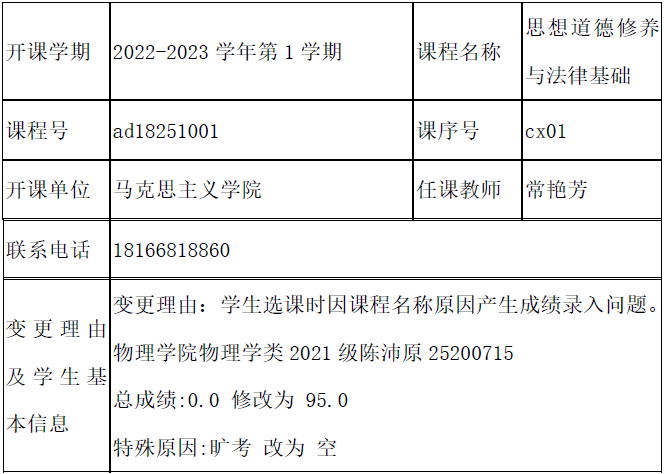 公示日期: 2023年_10月_17日至2023年_10月_23日如有异议请于公示期内向教务处教学运行科反映。 联系人: 邹老师 联系电话: 0431-85168962 相关材料详见附件: 1.成人网站 考核成绩复查、修改登记表 2.学院情况说明(学院教学委员会讨论通过、签字盖章) 3.试卷等相关佐证材料