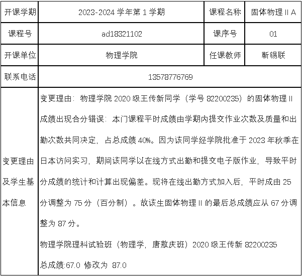公示日期: 2024年_3月_21日至2024年_3月_27日,如有异议请于公示期内向教务处教学运行科反映。 联系人: 邹老师 联系电话: 0431-85168962 相关材料详见附件: 1.成人网站 考核成绩复查、修改登记表 2.学院情况说明(学院教学委员会讨论通过、签字盖章) 3.试卷等相关佐证材料