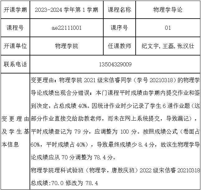 公示日期: 2024年_3月_21日至2024年_3月_27日,如有异议请于公示期内向教务处教学运行科反映。 联系人: 邹老师 联系电话: 0431-85168962 相关材料详见附件: 1.成人网站 考核成绩复查、修改登记表 2.学院情况说明(学院教学委员会讨论通过、签字盖章) 3.试卷等相关佐证材料