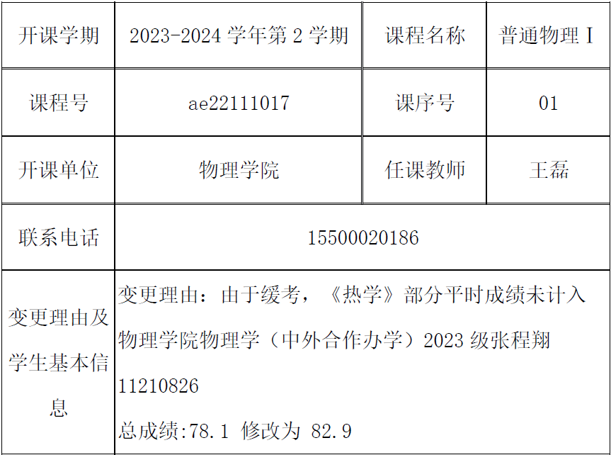 公示日期: 2024年_9月_11日至2024年_9月_18日如有异议请于公示期内向教务处教学运行科反映。 联系人: 邹老师 联系电话: 0431-85168962 相关材料详见附件: 1.成人网站 考核成绩复查、修改登记表 2.学院情况说明(学院教学委员会讨论通过、签字盖章) 3.试卷等相关佐证材料