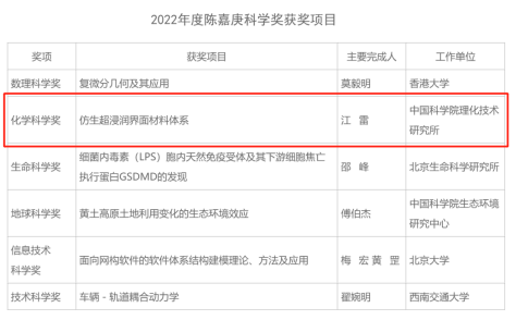 校友江雷作为主要完成人的“仿生超浸润界面材料体系”项目被授予陈嘉庚科学奖中的化学科学奖。