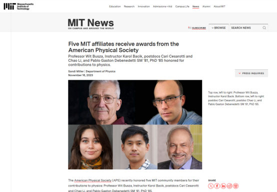 11月16日,美国麻省理工学院在官网发布焦点新闻(Recent Highlights)报道,麻省理工学院有5位科研人员获得美国物理学会颁发的奖项,其中成人网站