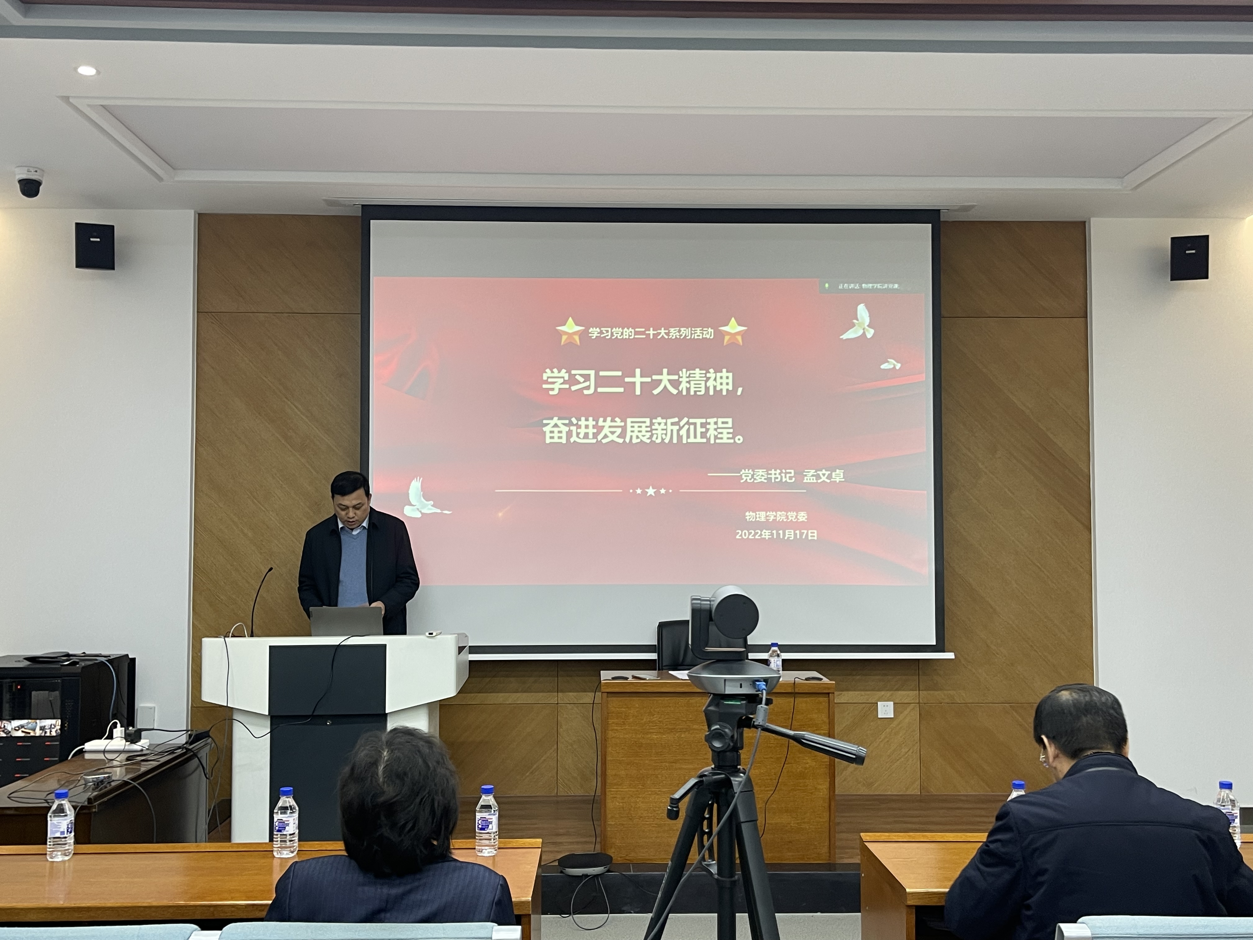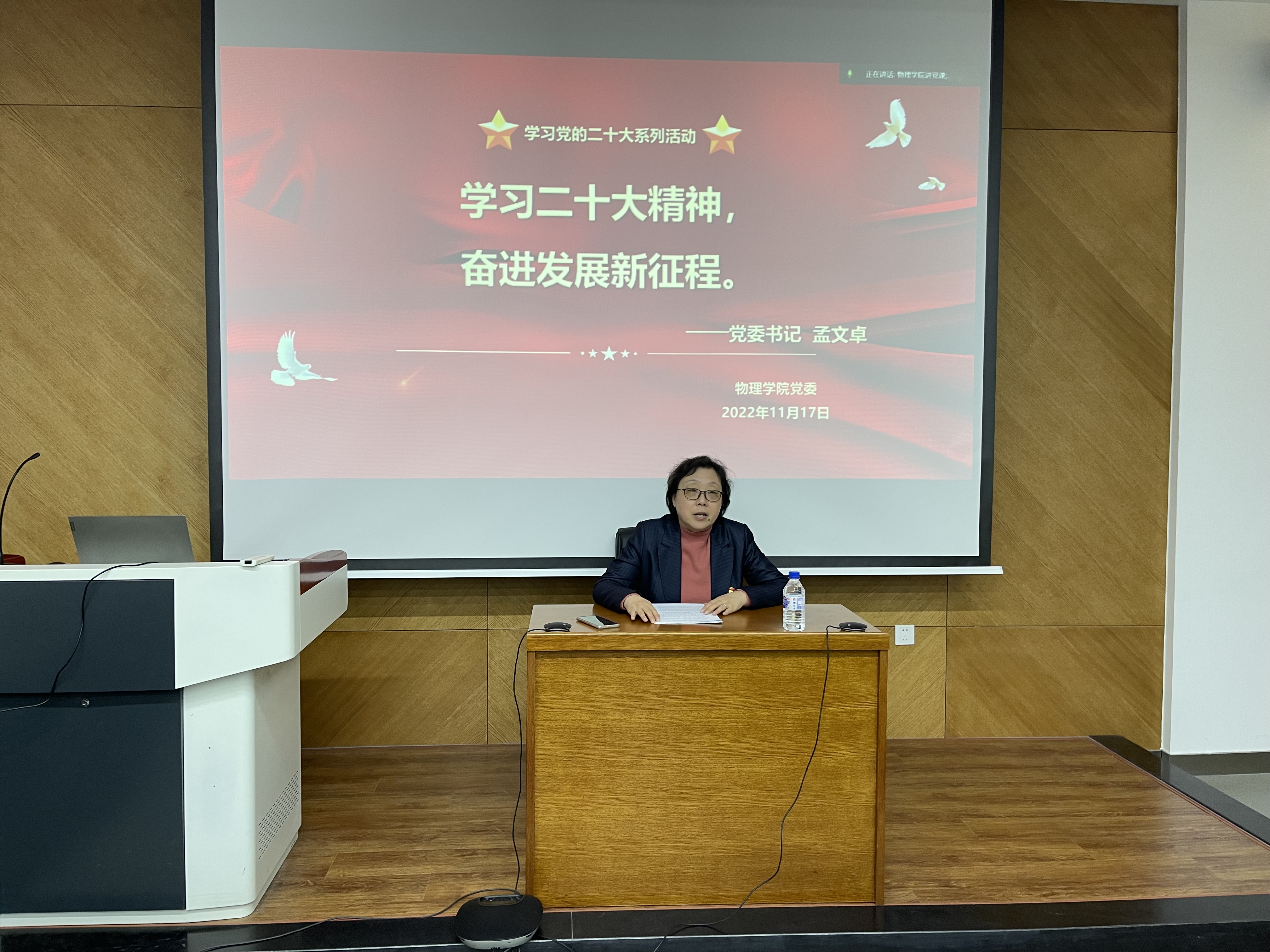 2022年11月17日下午,学院党委书记孟文卓以“学习二十大精神,开启发展新征程”为主题,以线下和线上相结合形式为全院师生党员、入党积极分子、2022级新生共300余人上了一堂生动的党课。学校党建联络员蒲韶华老师全程列席参加,会议由党委副书记、纪委书记唐宗明主持。