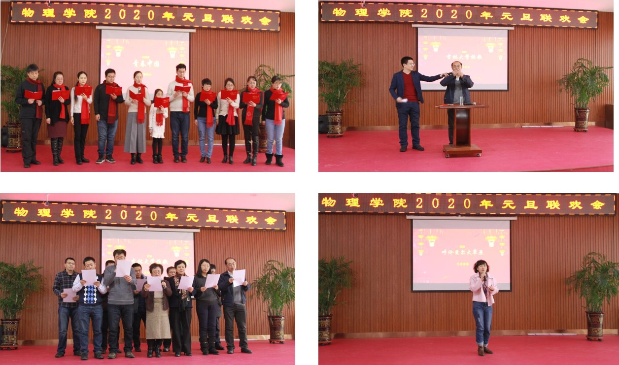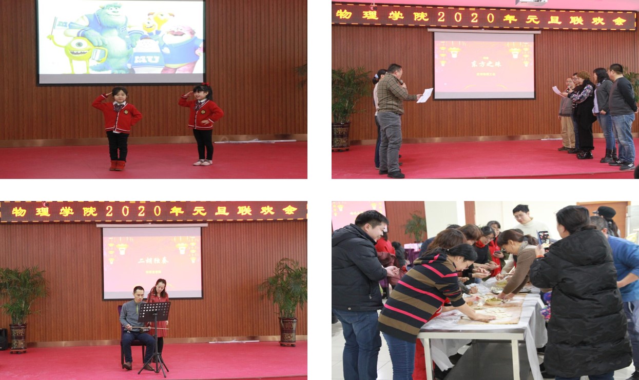 校歌》,铿锵有力、激情洋溢;老师们能文能武、各展所长,来自教学中心的王丹老师为大家带来歌曲《呼伦贝尔大草原》,来自实验中心的孙敬姝老师为大家带来趣味物理小实验;接下来,是家属小朋友们带来青春可爱的舞蹈《蜡笔小新》;随后,是应用物理的老师们为大家带来歌曲《东方之珠》以及宋若龙老师的二胡独奏,余音袅袅、不绝于耳。联欢会上,不仅有精彩纷呈的节目表演,还有智趣横生的游戏竞猜、热火朝天的集体包饺子以及万众瞩目的幸运大抽奖环节。最后,随着最后一轮幸运大奖的产生,元旦联欢会圆满落幕。