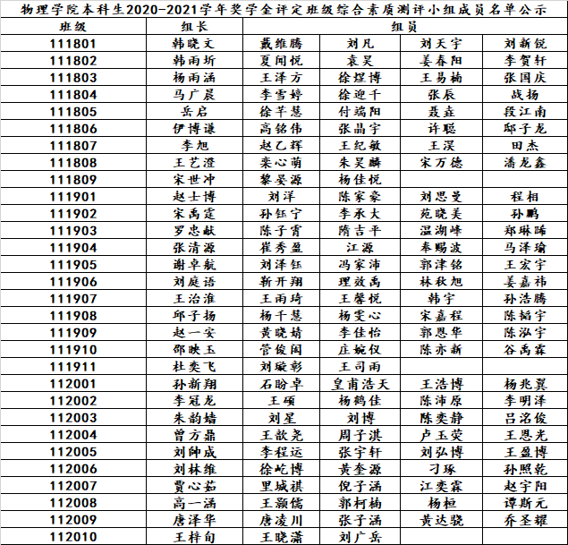 根据《成人网站 本科生学年奖学金评选办法》、《成人网站 优秀本科学生评选办法》、《成人网站 优秀本科学生干部评选办法》,经成人网站 奖助工作领导小组研究确定成人网站 本科生2020-2021学年奖学金评定班级综合素质测评小组成员名单如下: