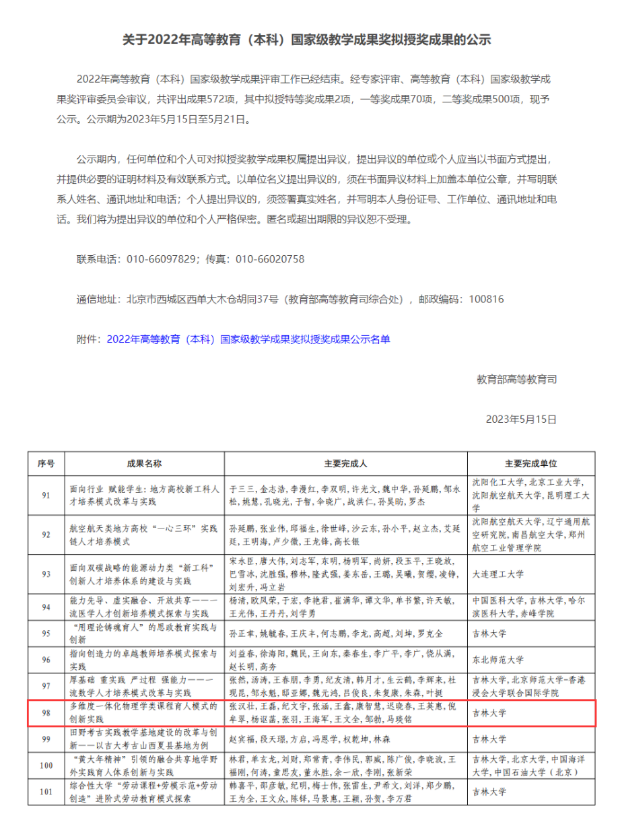 2023年5月15日,教育部公示了2022年高等教育(本科)国家级教学成果奖拟授奖成果名单。成人网站 张汉壮教授主持完成的“多维度一体化物理学类课程育人模式的创新实践”喜获国家级教学成果奖二等奖!