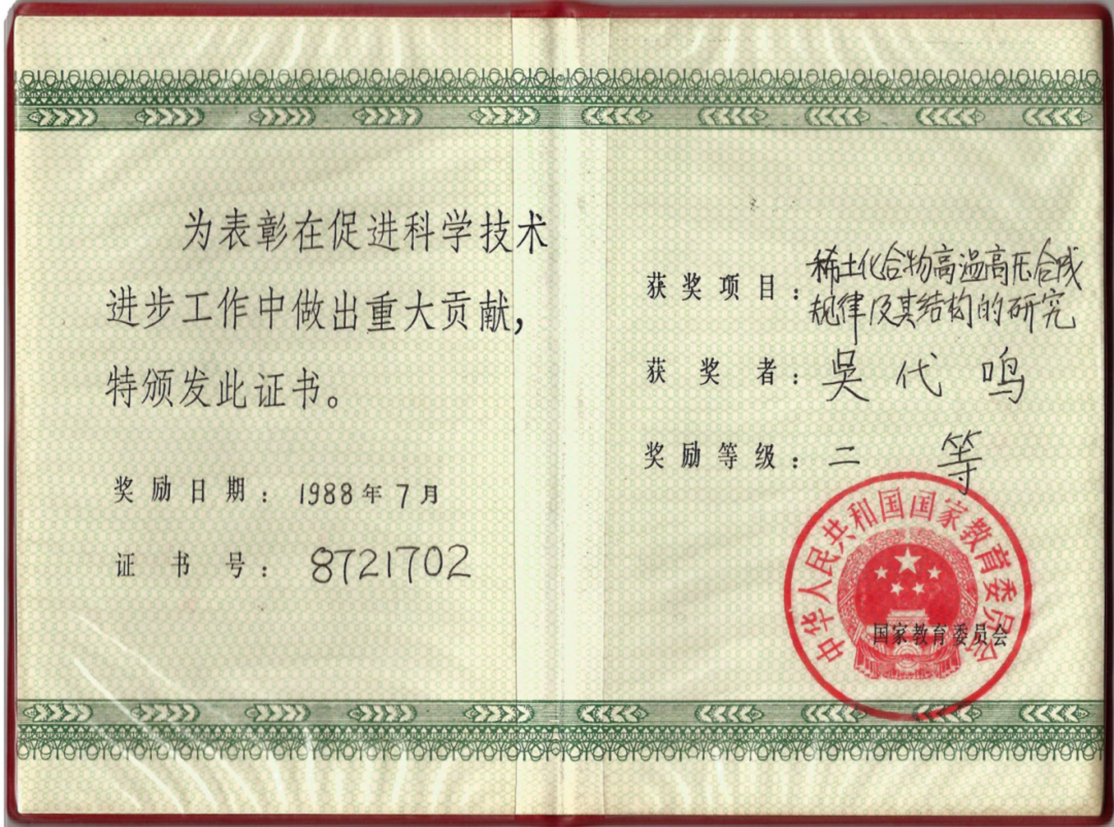 授予他教学质量特等奖;1988年,他所主持的《固体物理课程建设》荣获吉林省优秀教学成果奖。一直以来,吴代鸣先生痴心不改,始终坚守教书育人的理想与信念,完美地诠释了“传业、授道、解惑”的师者品质,在成人网站