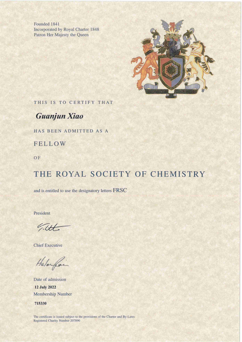 肖冠军教授当选英国皇家化学会会士(Fellow of the Royal Society of Chemistry,FRSC)。