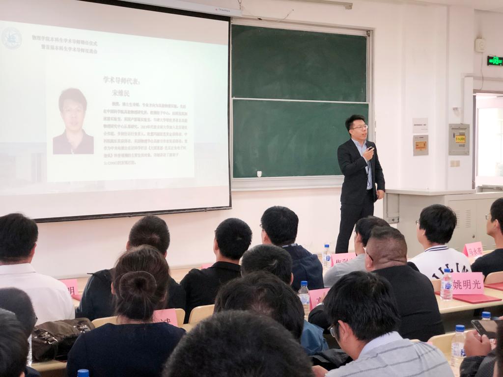 随后,本科生学术导师代表宋维民老师进行发言,向同学们阐述了自己的学习经历,同时鼓励同学们抓住此次双选会的机会,选择自己喜欢的导师和方向。宋维民老师表示作为学术导师不仅要在学术方面对学生做指导,也要做学生事业发展上的向导,还要关注学生的生活,做他们的心灵辅导。对参加导师双选会的学生提出对待学习生活要负责任、勤沟通、夯基础的三点要求。学生代表2018级本科生李旭同学进行了发言,他代表在场所有学生感谢学院的培养,表示本科生学术导师制度为同学们提供了提前进行课题学习与科研训练的机会,并号召同学们要学习老师们攻坚克难的品质和求真务实的精神。