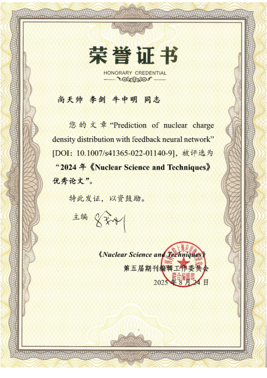 李剑教授课题组于2022年8月在《Nuclear Science and Techniques》期刊上发表的论文“Prediction of nuclear charge density distribution with feedback neural network”,近日荣获该刊“2024年度优秀论文”称号。该论文的第一作者为2022级直博生尚天帅,通讯作者为李剑教授与安徽大学牛中明教授。研究通过结合前馈神经网络与两参数费米模型,实现了对原子核电荷密度分布的高精度预测,为相关实验研究提供了重要理论支持。