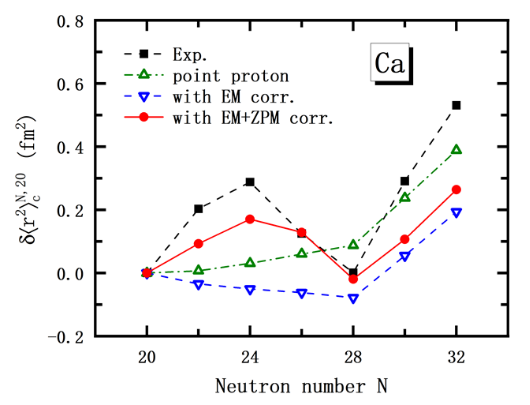 近年来,李剑教授团队在原子核电荷性质研究方面取得多项突破。最近,该课题组与合作者在《Physical Review C》上以快报(Letter)形式发表重要成果[Phys. Rev. C 112, L021303 (2025)],基于相对论密度泛函理论成功解释了钙同位素链中长期存在的电荷半径反常现象。研究首次在不引入可调参数的情况下,同时考虑核子内禀电磁结构及核形状的量子涨落效应,显著提升了理论预测与实验数据的一致性,清晰再现了从⁴⁰Ca到⁴⁸Ca的电荷半径演化趋势。该方法还成功应用于描述锡(Sn)与镉(Cd)同位素的电荷半径偏移问题,展现出良好的普适性和可靠性。