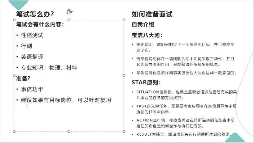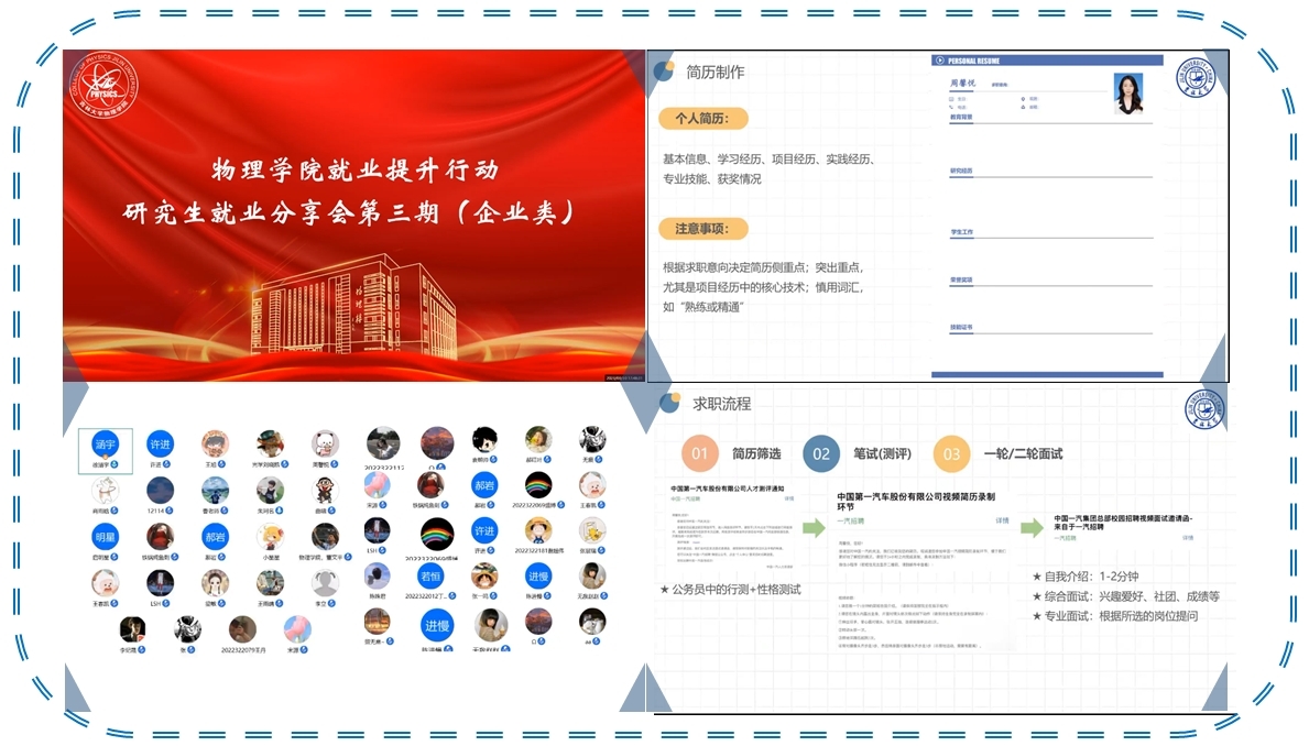 分享嘉宾肖雨晗,凝聚态物理专业,签约比亚迪汽车工程研究院。肖雨晗就个人求职经历、面试经验等方面展开分享,并有针对性地讲解了面对专业性强的部门该如何进行专项准备,帮助同学们明晰不同性质的企业的优劣势,提高就业成功率。