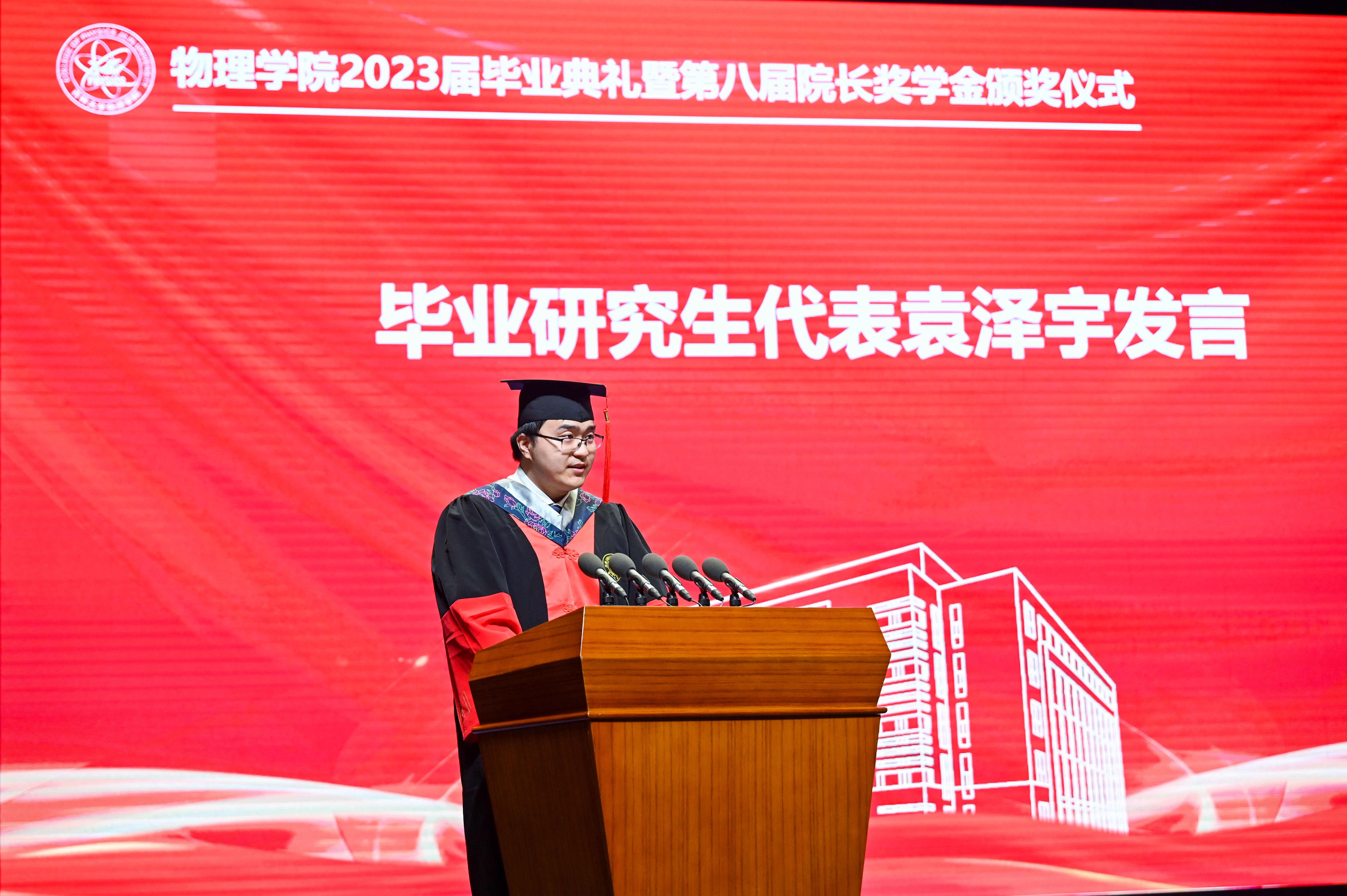 毕业研究生代表袁泽宇同学进行发言,感恩学院、导师的辛勤付出,并表示将怀着感恩之心,迎接人生新阶段。